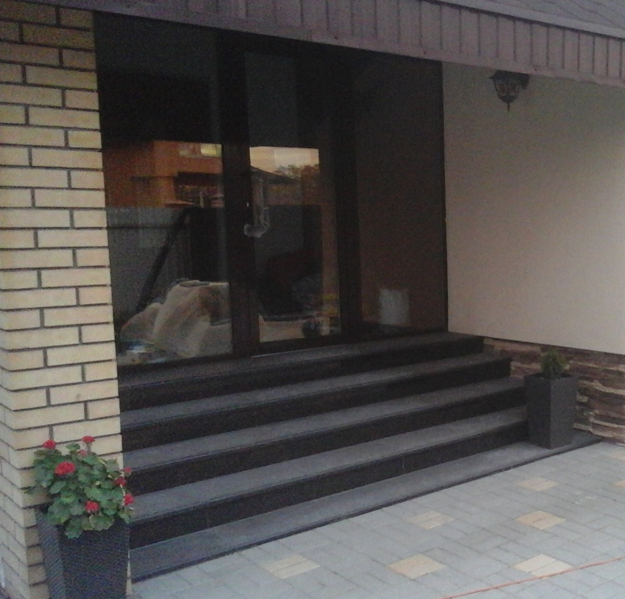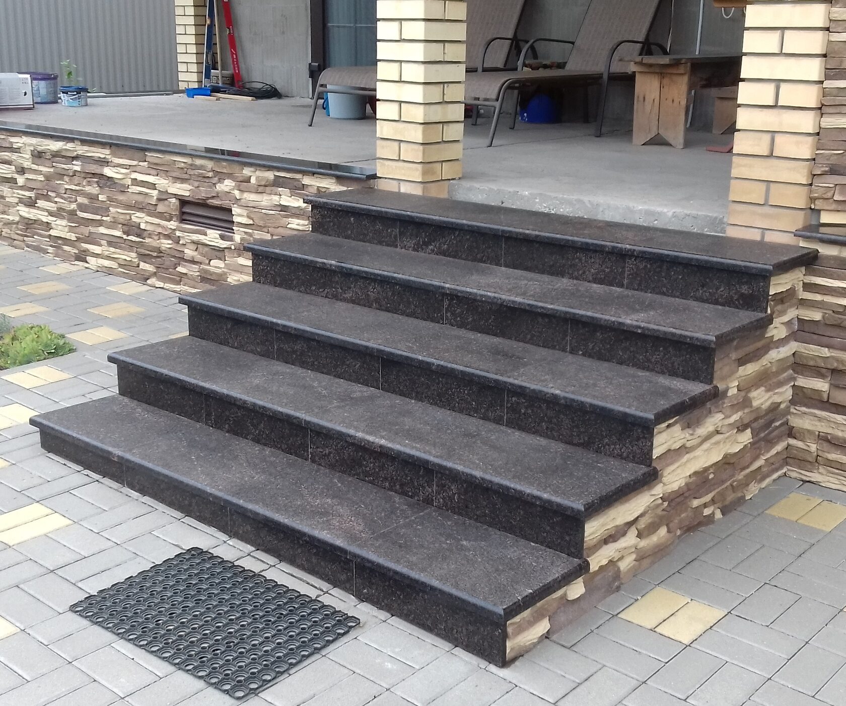 Был уже спланированный дизайн участка. Подобрали и установили подходящие ступени (в дальнейшем заказали облицовку бело-коричневым камнем вокруг).