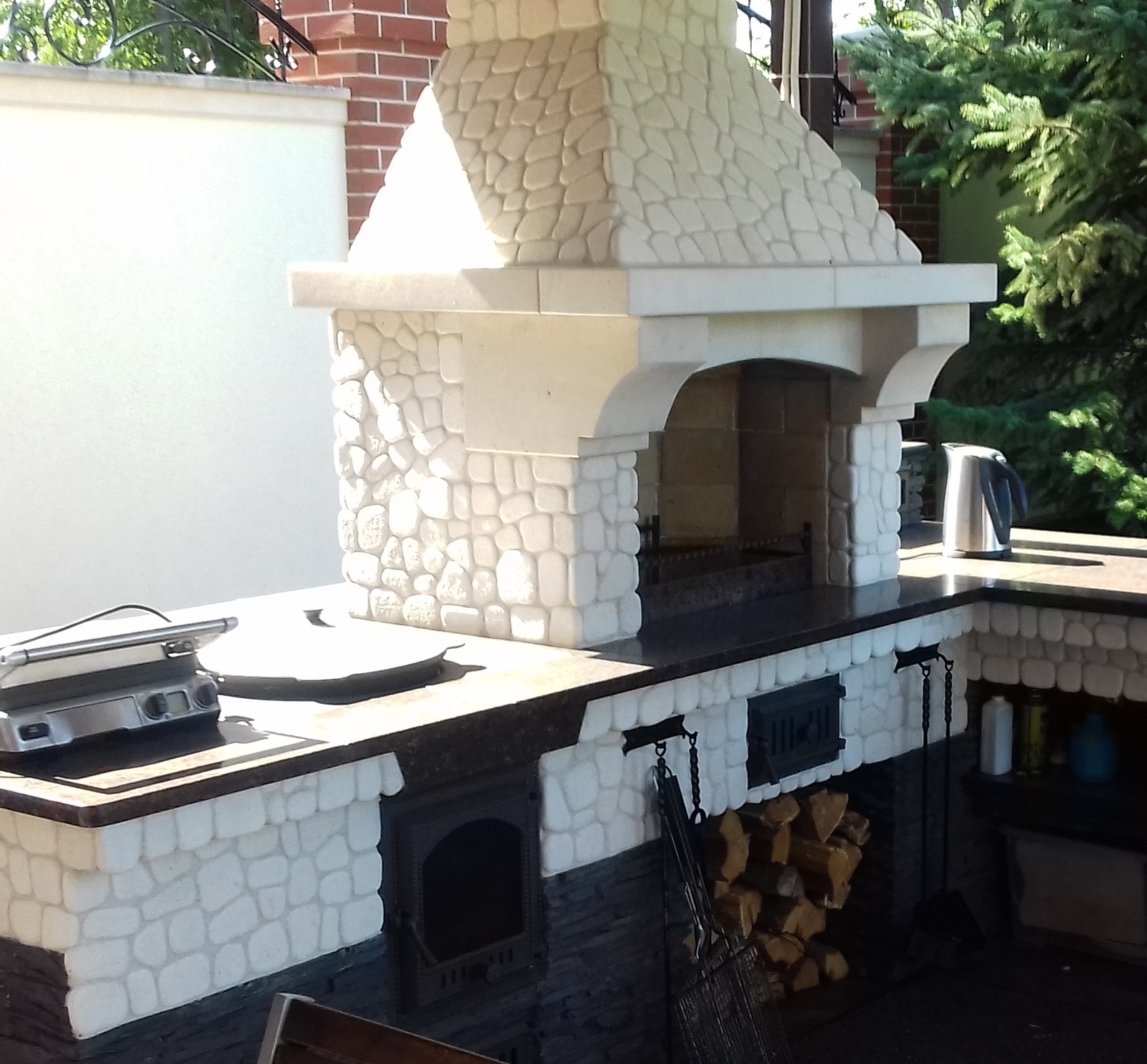 Старая барбекю развалилась. Была задача скопировать старый дизайн в деталях. Произвели замеры, закупку, резку, отделку камня.